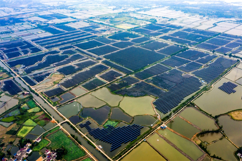 一张张光伏板有序排列,在波光粼粼的水面上源源不断将光能转化为绿色电能。5月28日,国家能源集团安徽铜陵电厂的东湖一期渔光互补光伏项目(总容量约200兆瓦)正式并网发电,绘就乡村新图景,助推乡村振兴。
