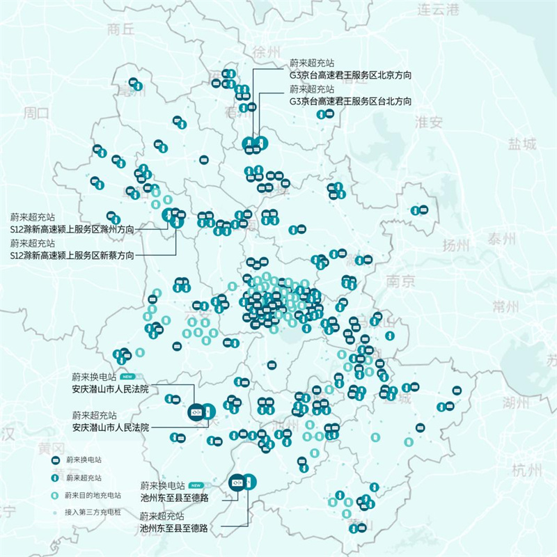 截至今日,蔚来已于安徽建成换电站152座、充电站187座、1,098根,并接入38,936根第三方充电桩。